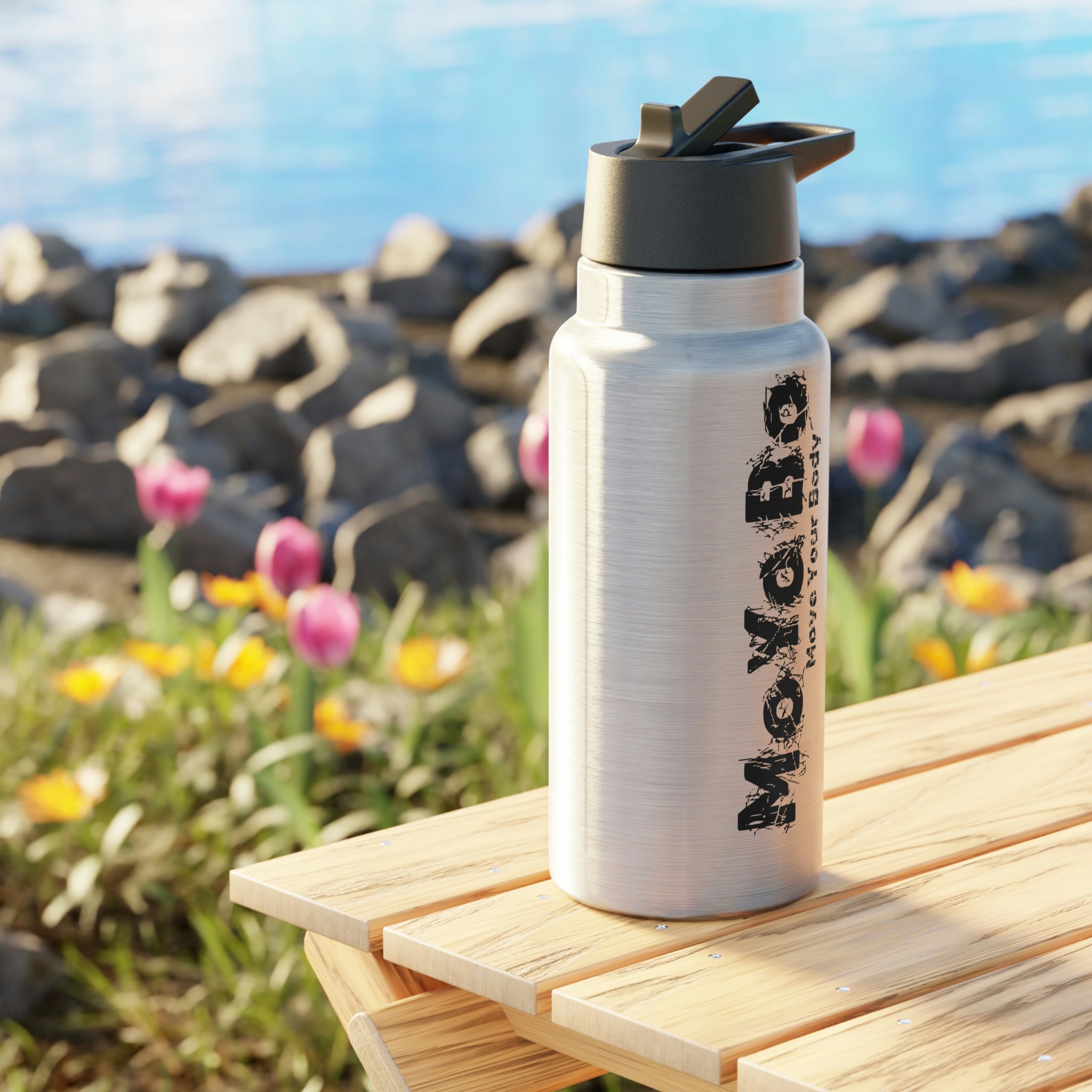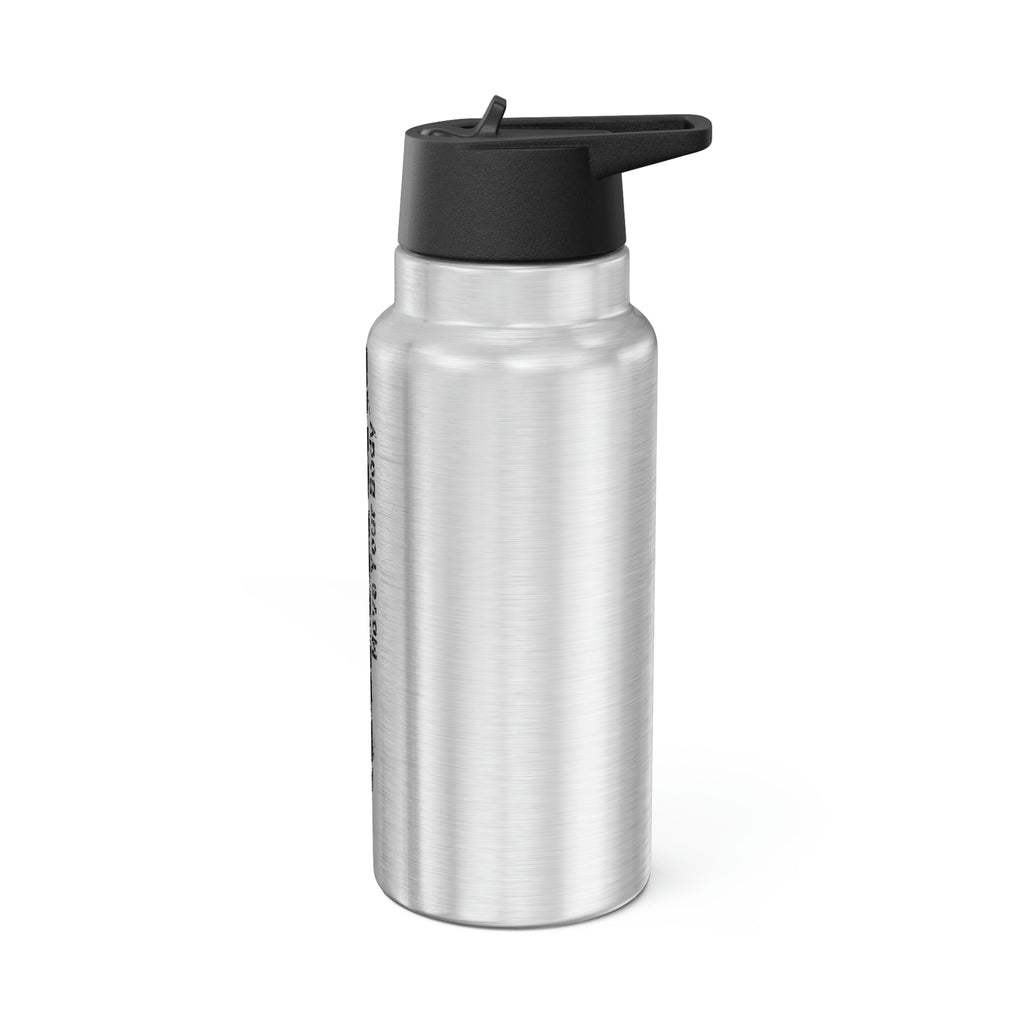 .: Materials: stainless steel bottle, black plastic screw-on cap