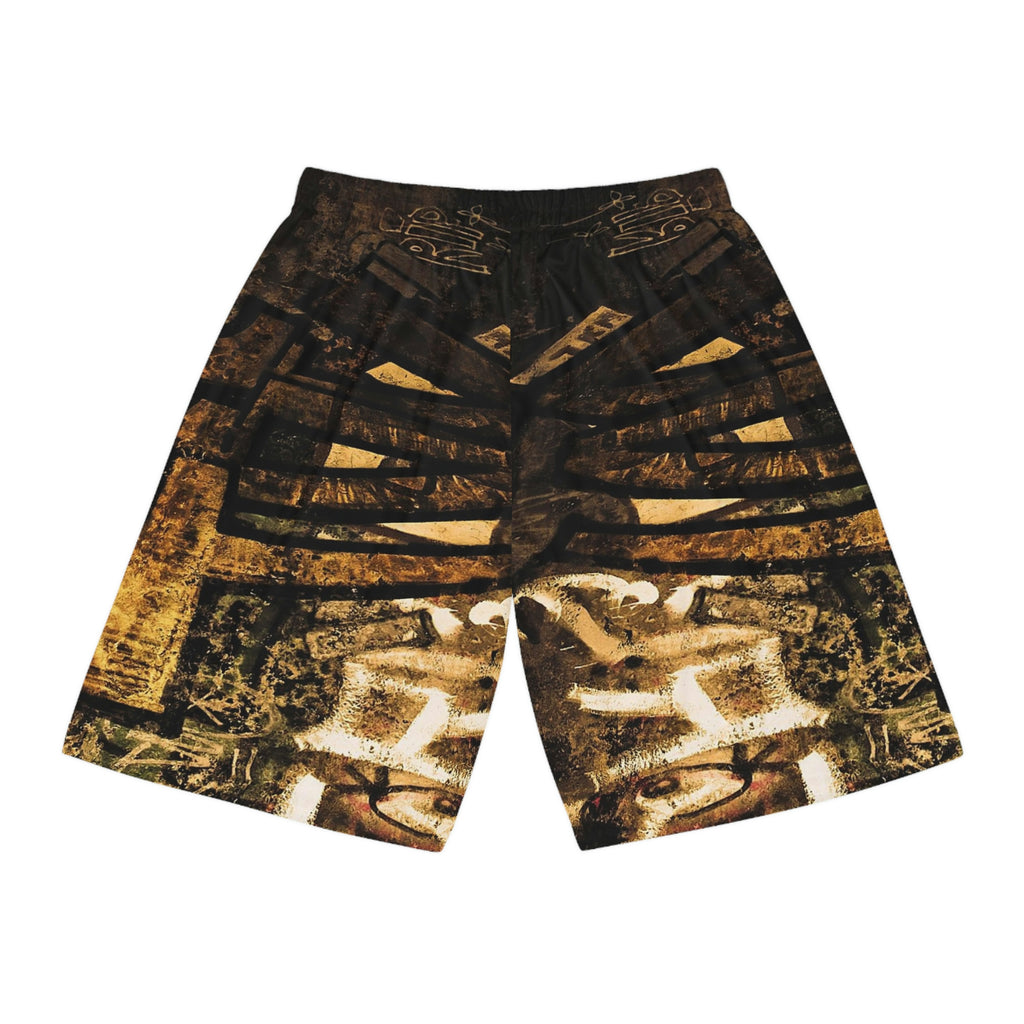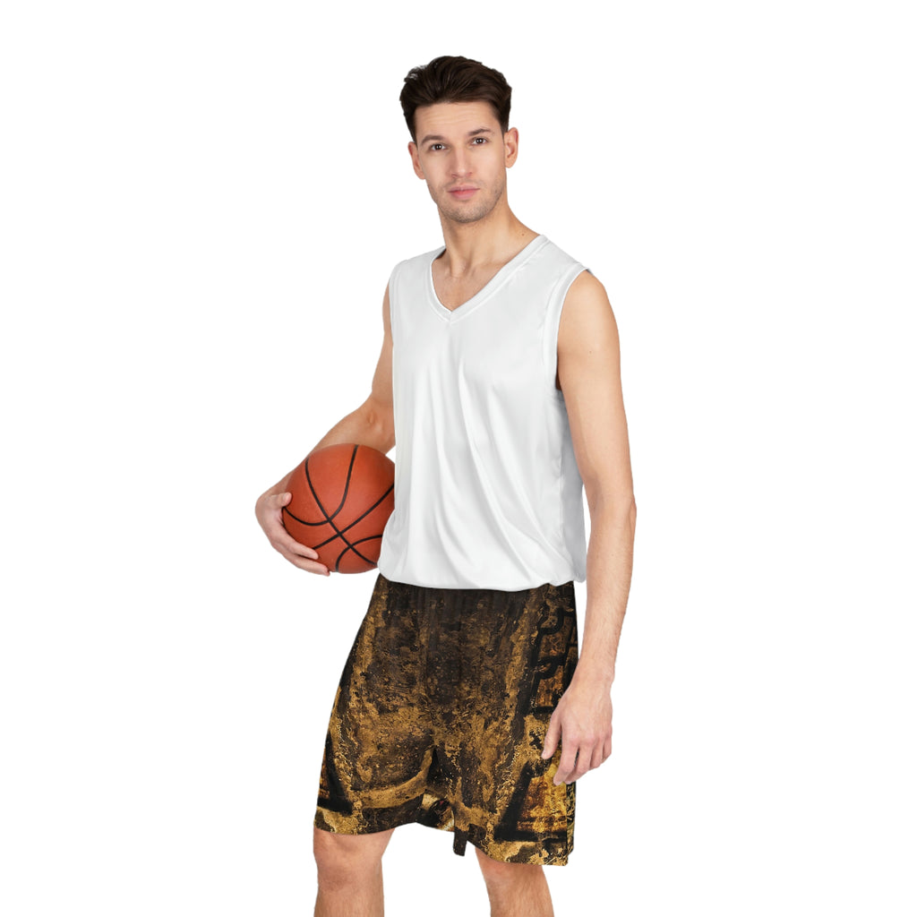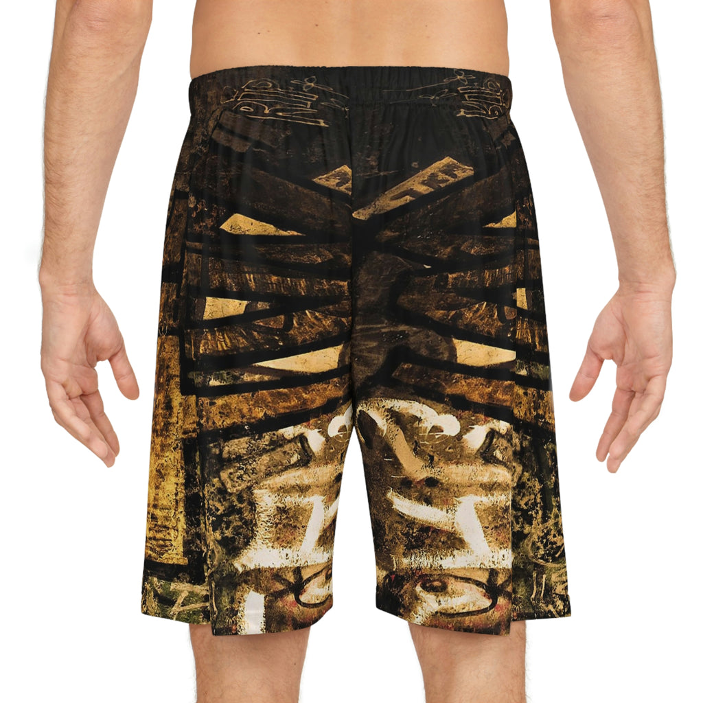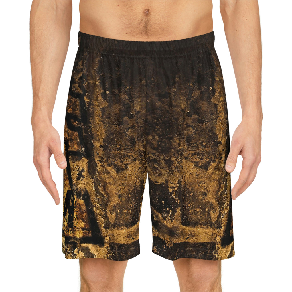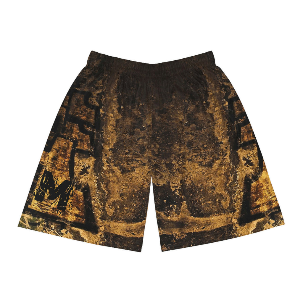 M basketball shorts. Black M on a dark background. They're comfortable and adjustable with an elastic waistband and drawstring and they are moisture-wicking and odor-resistant. Pair it with a M basketball jersey to be game-ready.
