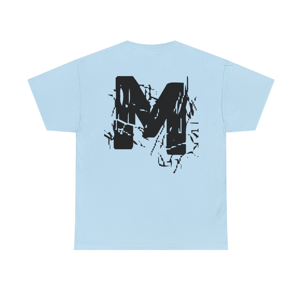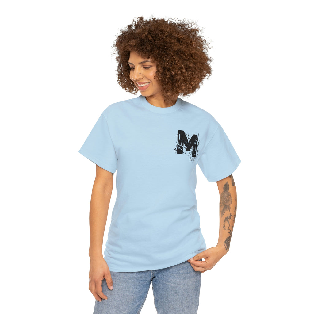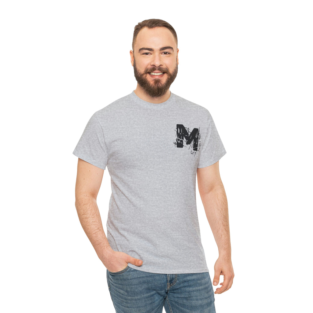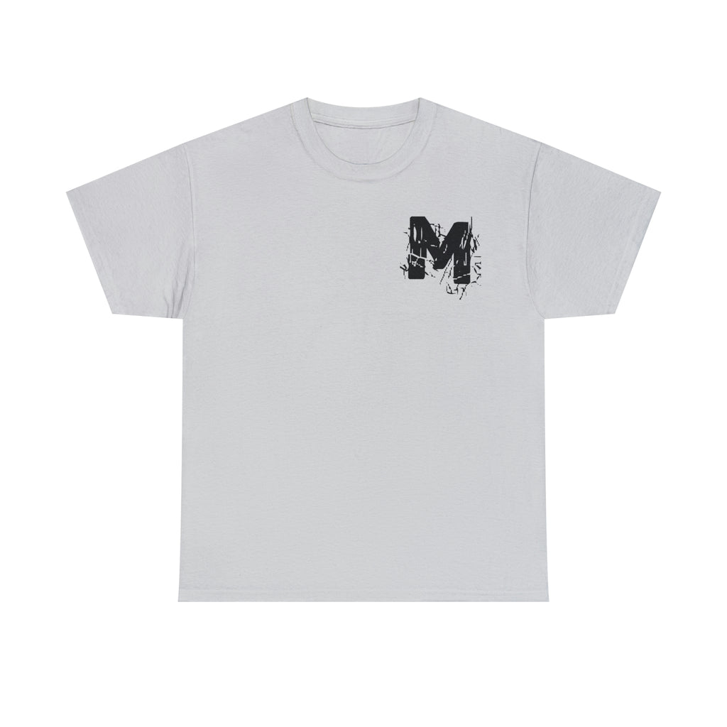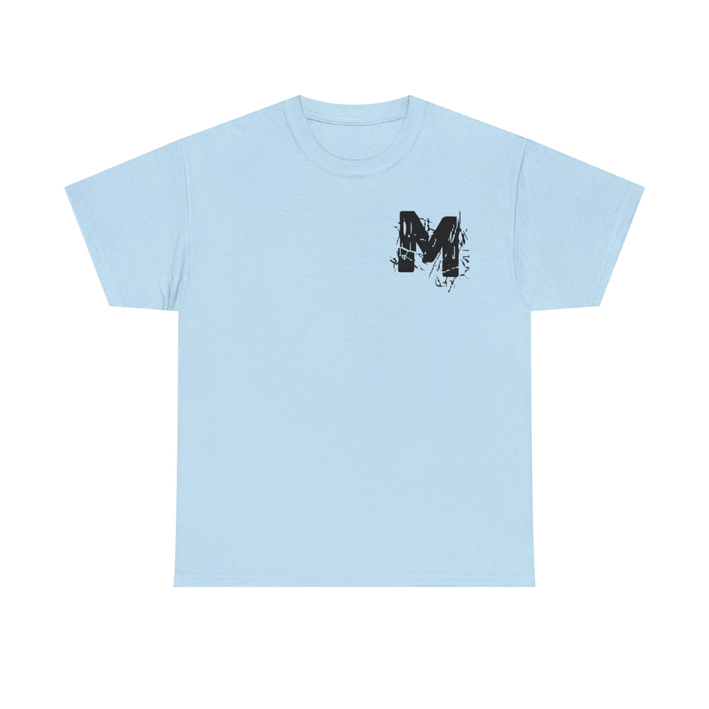 The M heavy cotton light tee with front and back logos. This is a lightweight Tee.