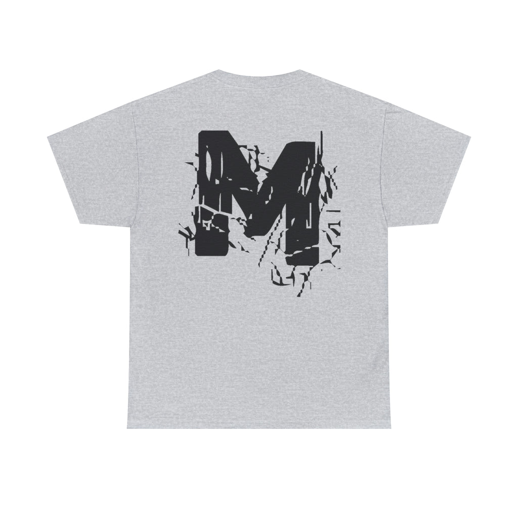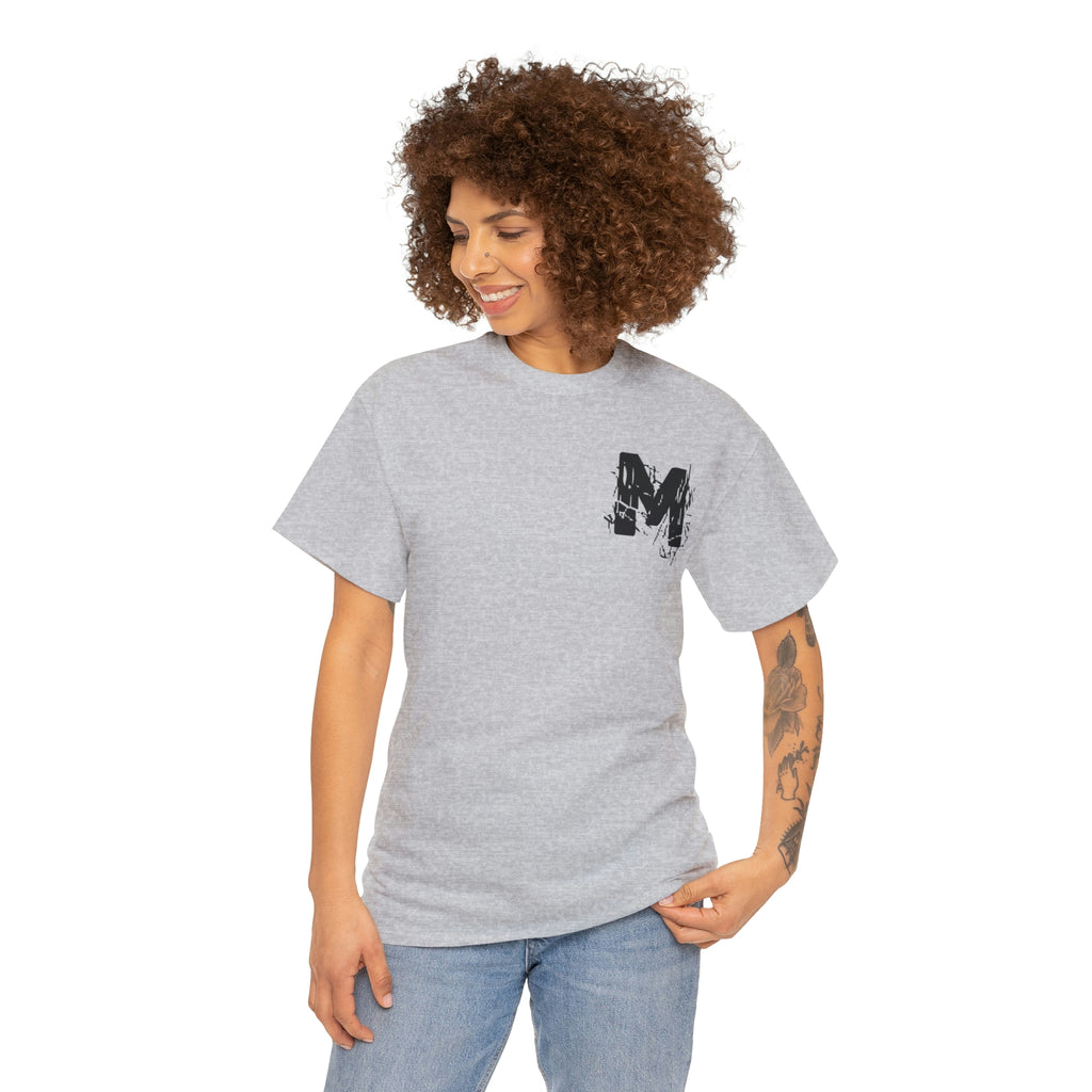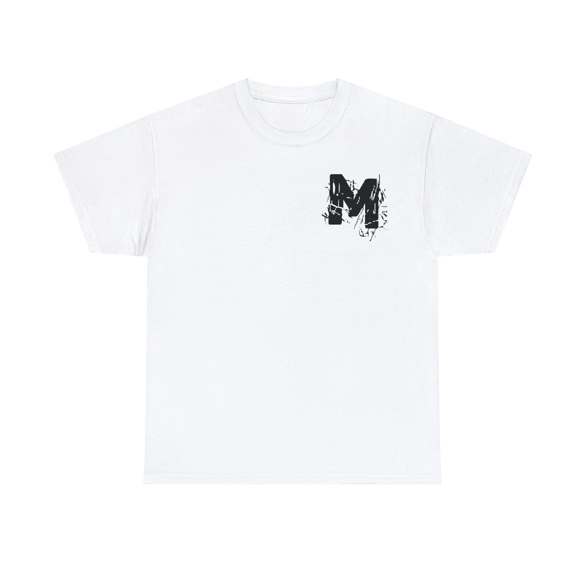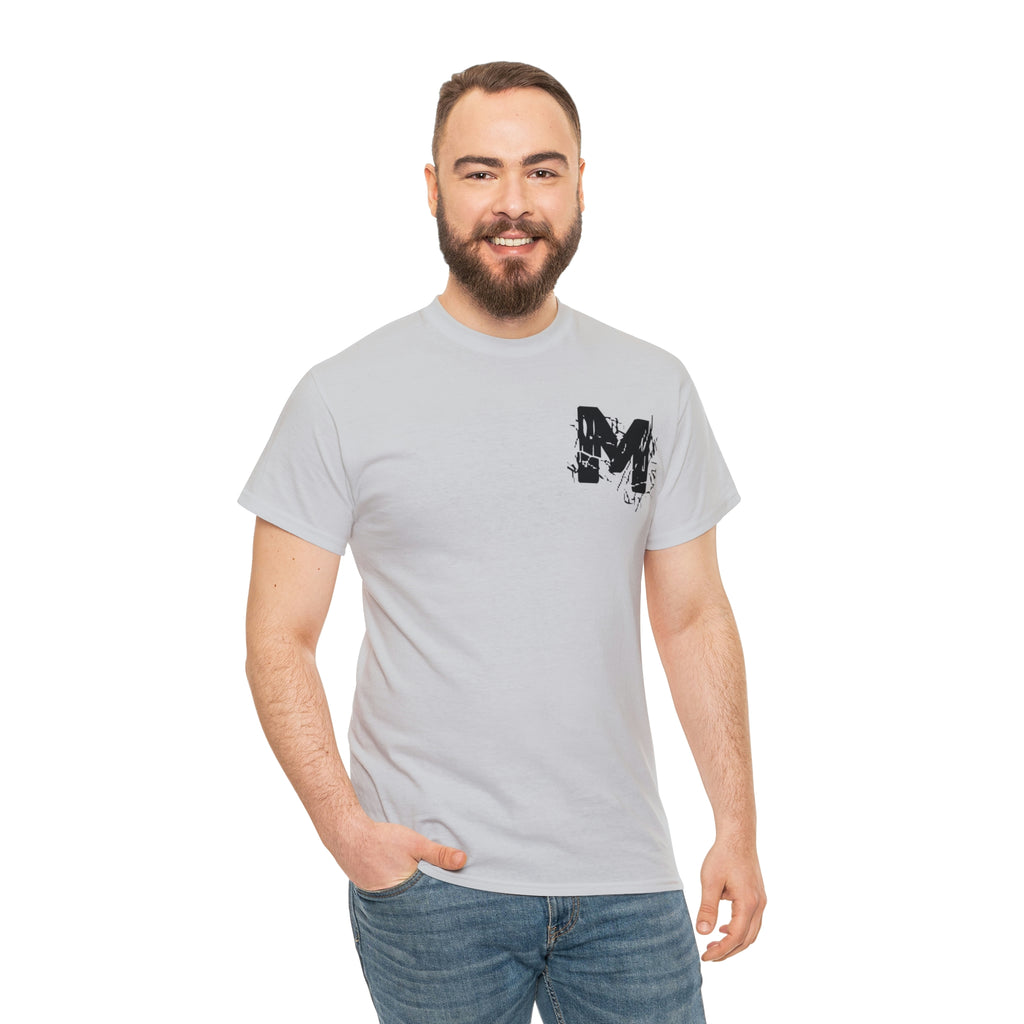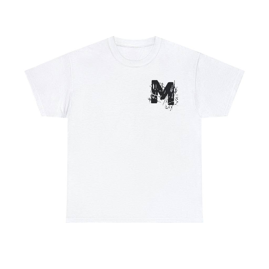 The M heavy cotton light tee with front and back logos. This is a lightweight Tee.