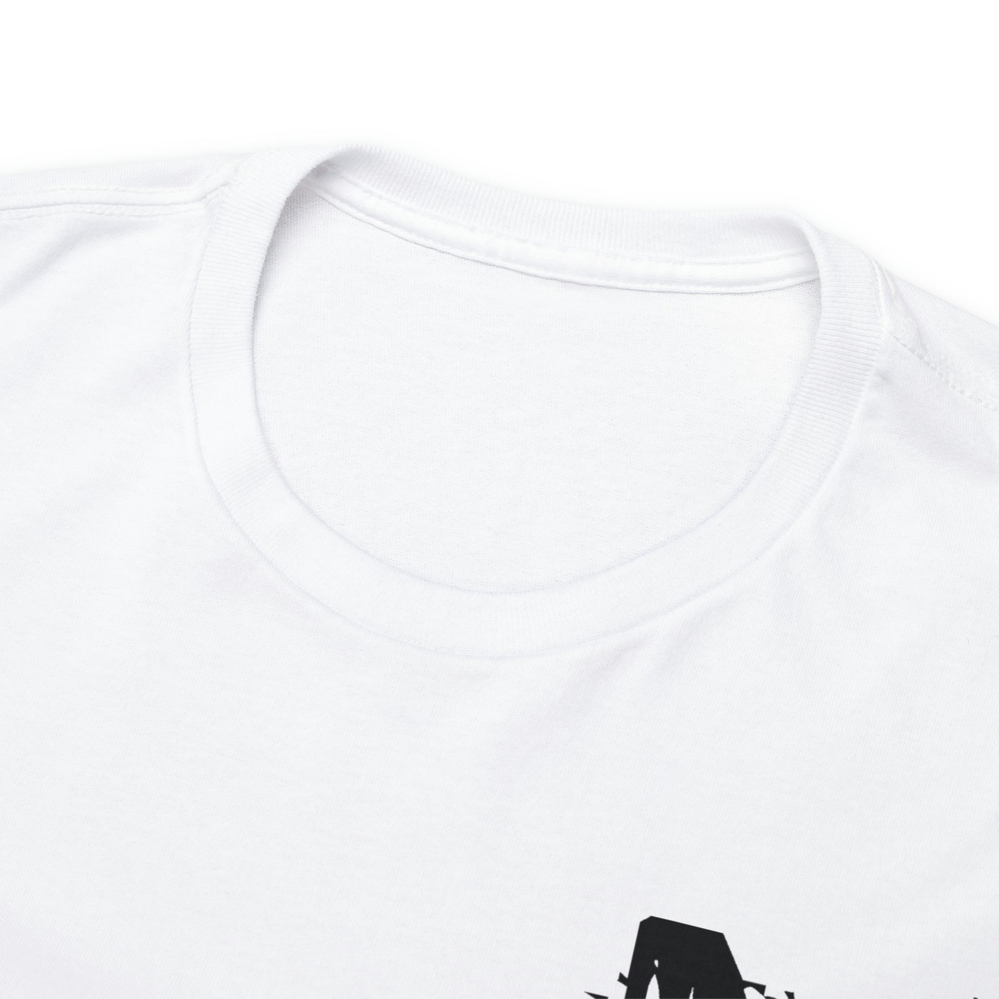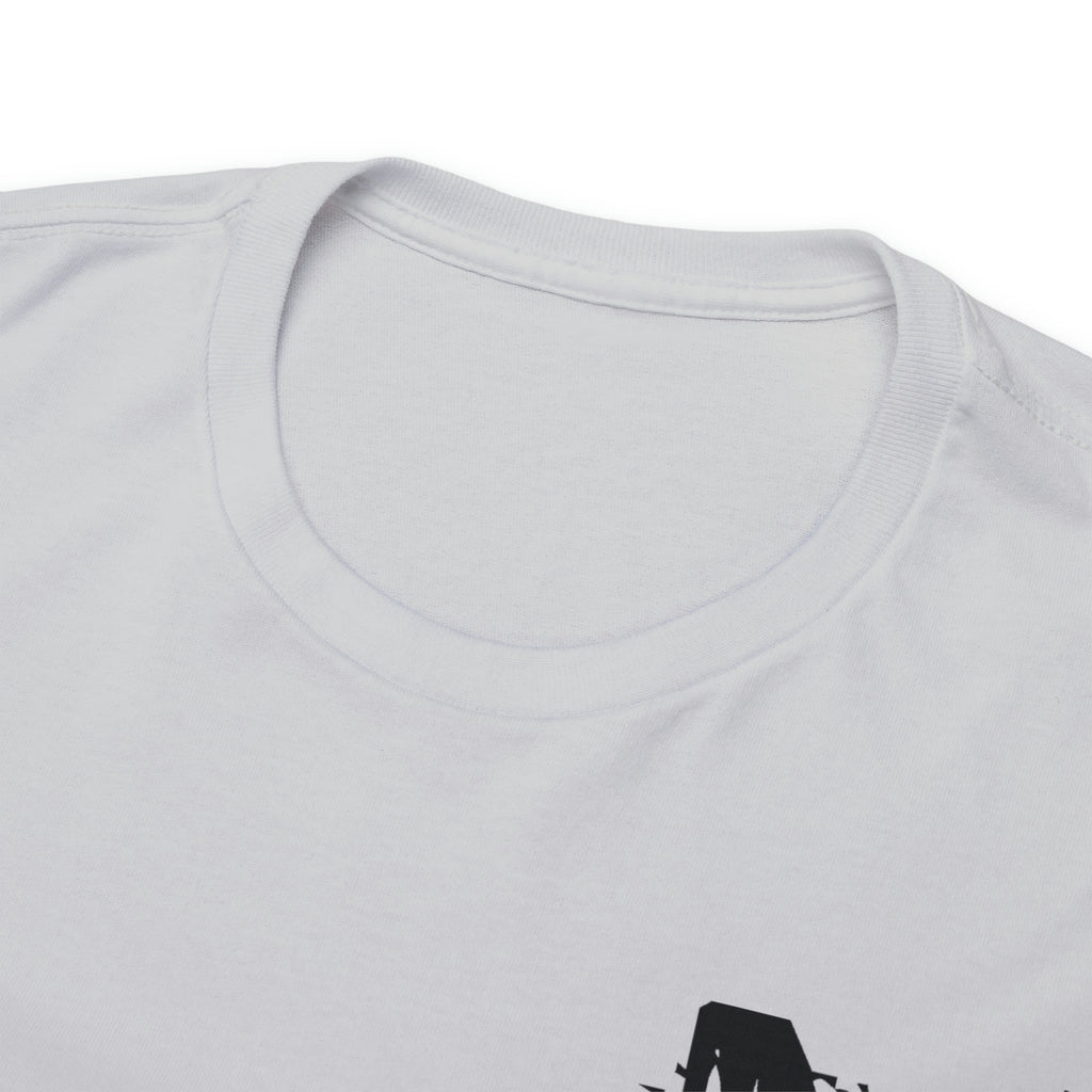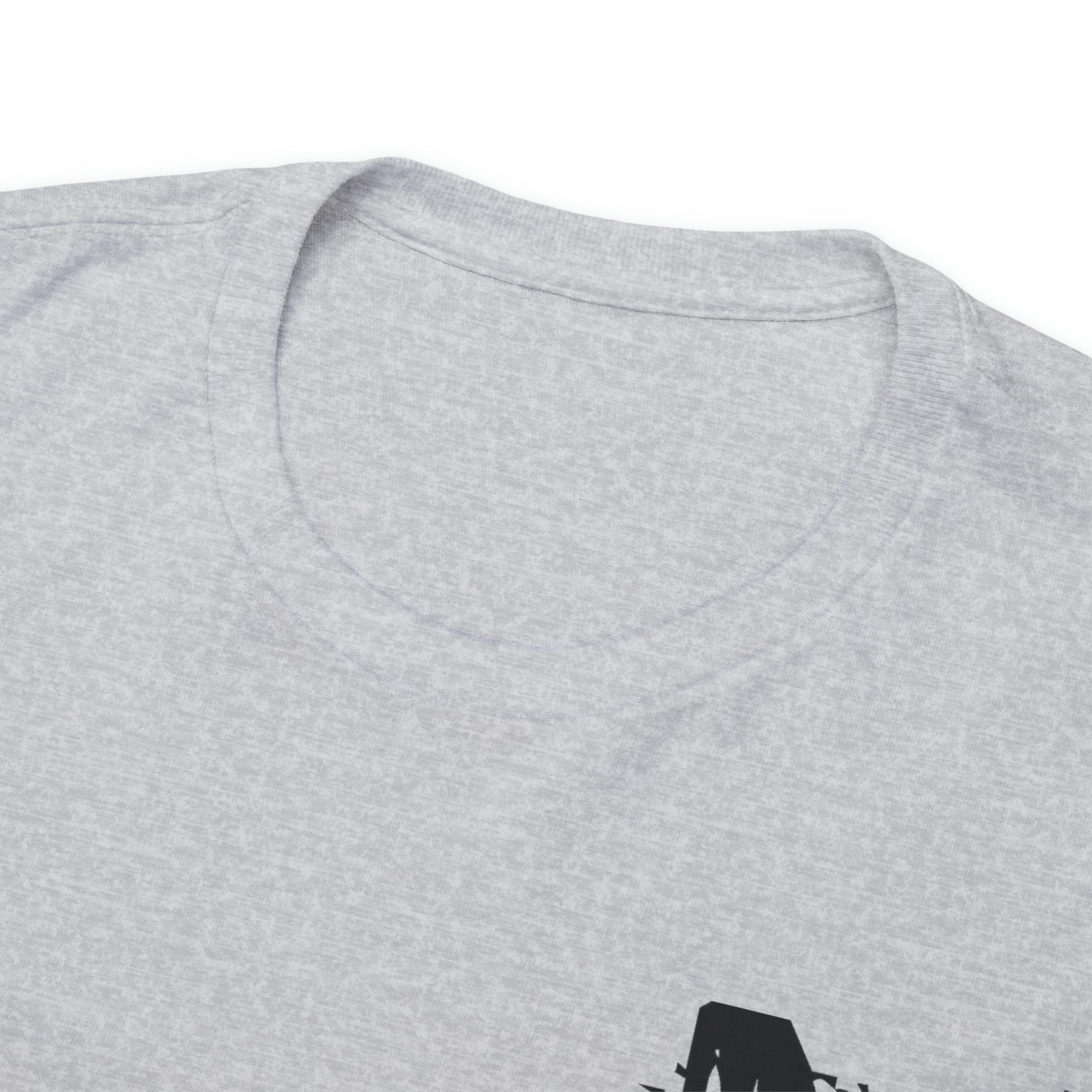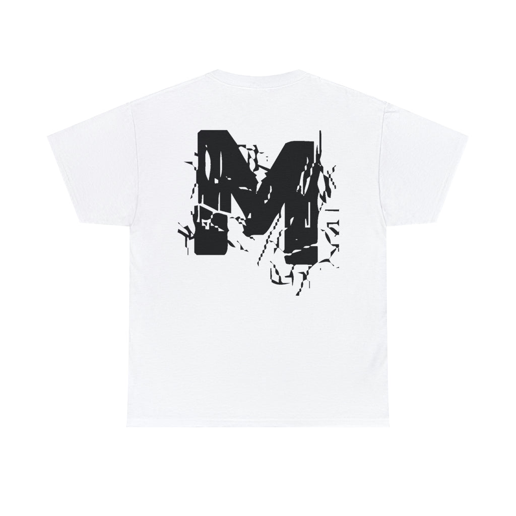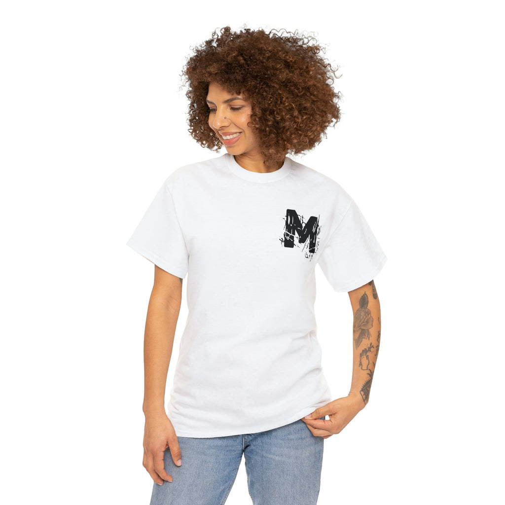 The M heavy cotton light tee with front and back logos. This is a lightweight Tee.