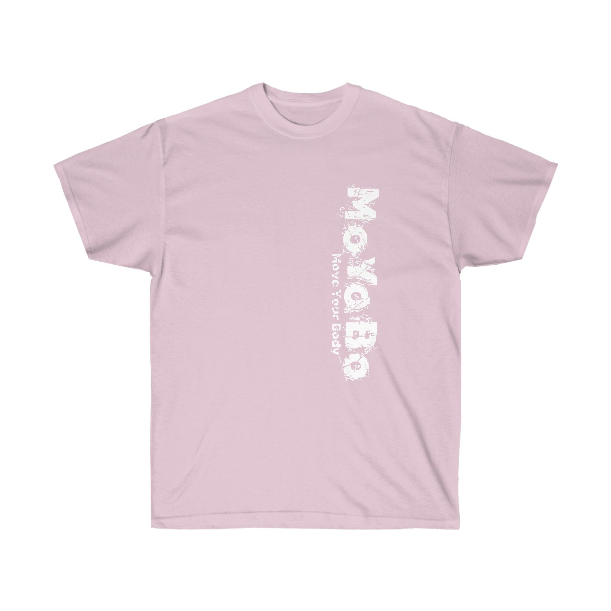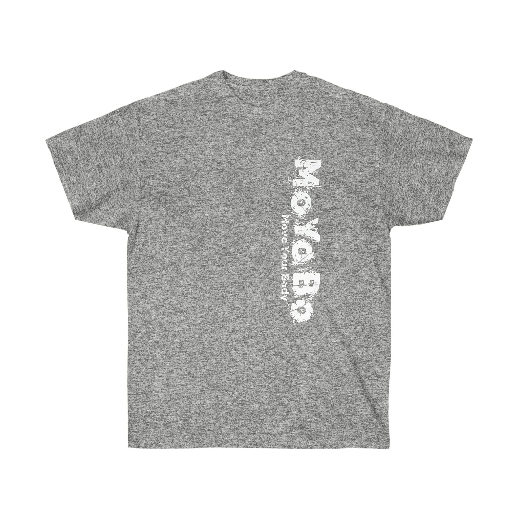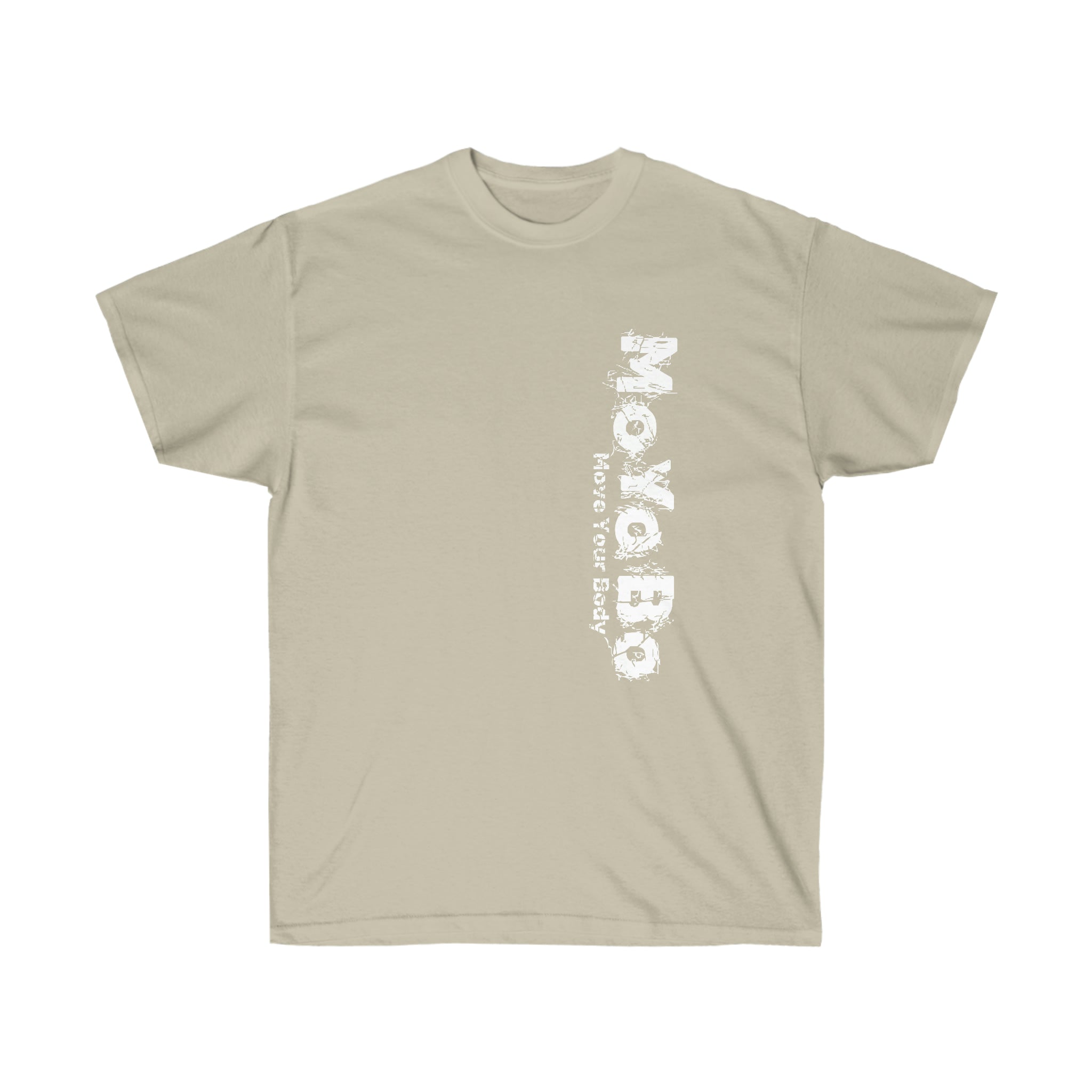 This vertical ultra cotton tee is a MoYoBo basic. This is a heavy Tee. This has the vertical brand on the front left and a small one on the rear at the nape of the neck.