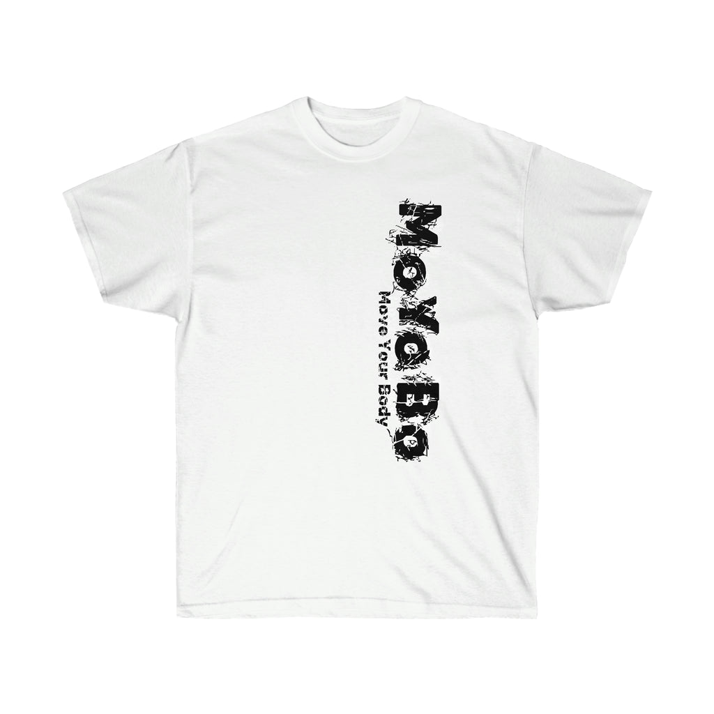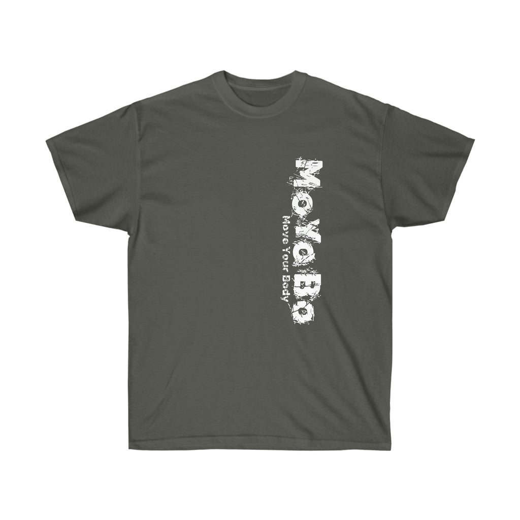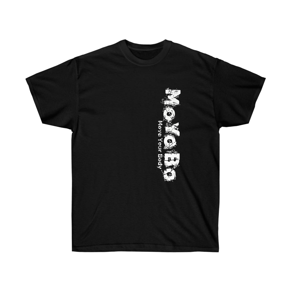 This vertical ultra cotton tee is a MoYoBo basic. This is a heavy Tee. This has the vertical brand on the front left and a small one on the rear at the nape of the neck.